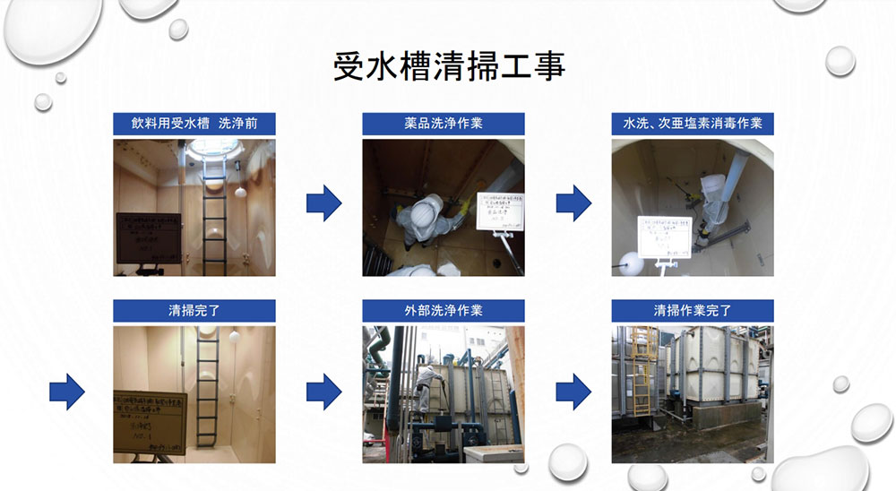 プール、マンション、ゴルフ場、工場などさまざまな現場で受水槽清掃に対応した実績が豊富にございます。水道法により受水槽の有効容量が10立方メートルを超えるものについては、年1回定期的に貯水槽の清掃を行なう必要があります。